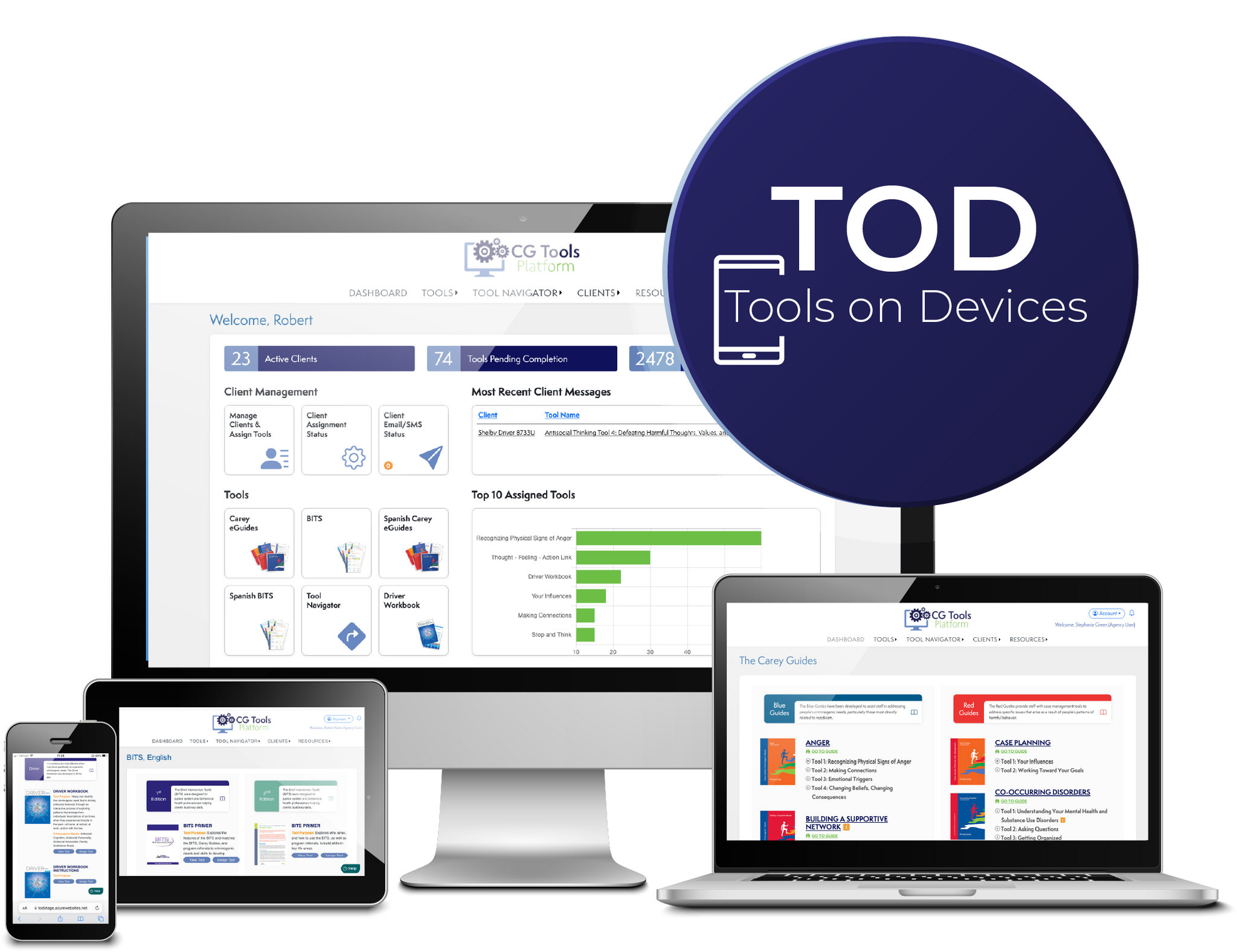 Tools on Devices (TOD) puts the power of Carey Group’s suite of cognitive behavioral tools in the hands of justice system professionals and their clients. With TOD, staff can electronically assign fillable versions of Carey Guide tools, BITS, and the Driver Workbook to the people on their caseload. Clients complete and submit the tools from their smartphone, tablet, or personal computer. No more lost assignments, no need for a printer.